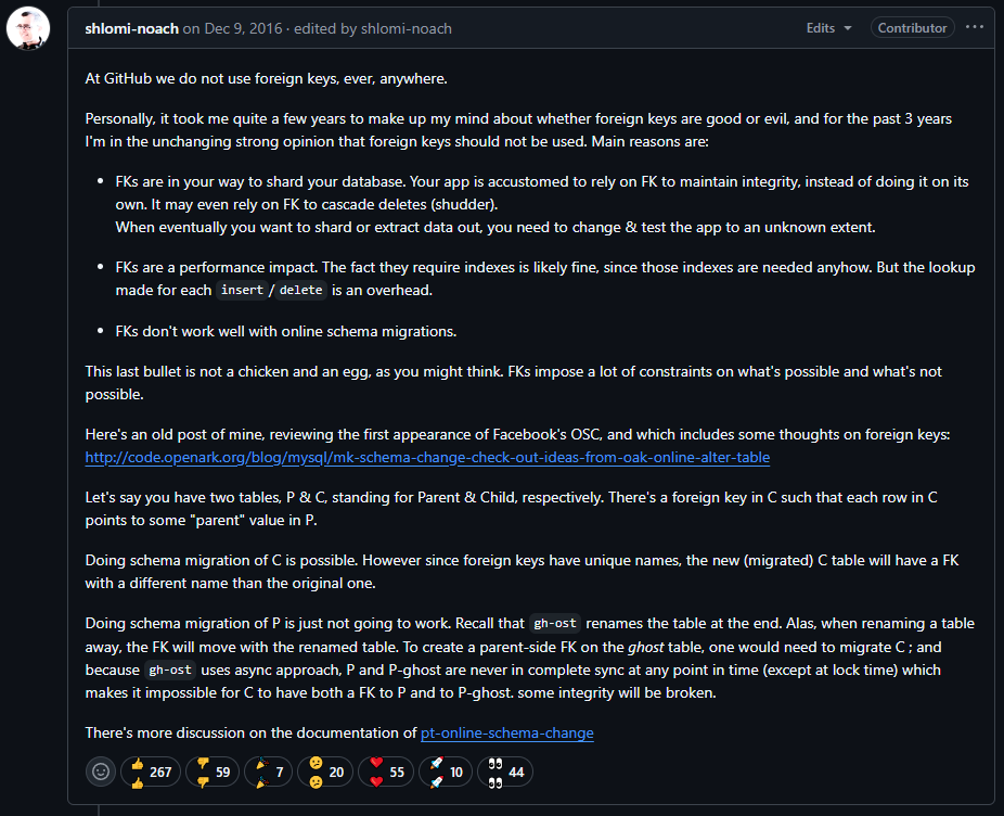 위 Github comment 는 gh-ost 라는 DB 마이그레이션 관련 Github 공식 서비스 레포에서 한 유저가 해당 프로젝트엔 외래키가 적용되어있지 않다는 말에 Github 개발자가 대답한 내용이다. 2016년 코멘트이지만 외래키에 꽤나 회의적이고 확고한 의견이다.