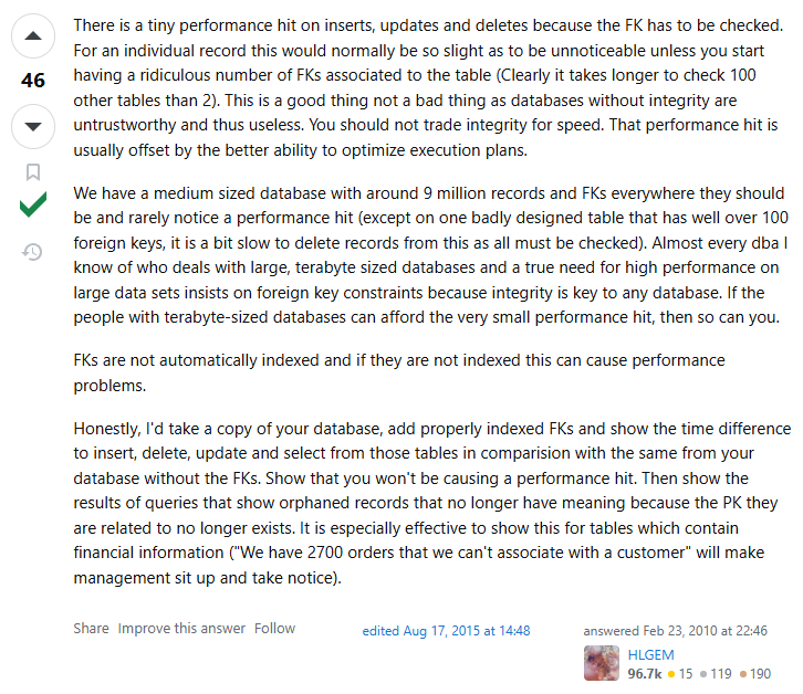 위 코멘트는 Stackoverflow 에서 외래키 성능에 대한 논의에 대해 평판점수 약 96,718점인 DB 엔지니어가 대답한 것이다. '