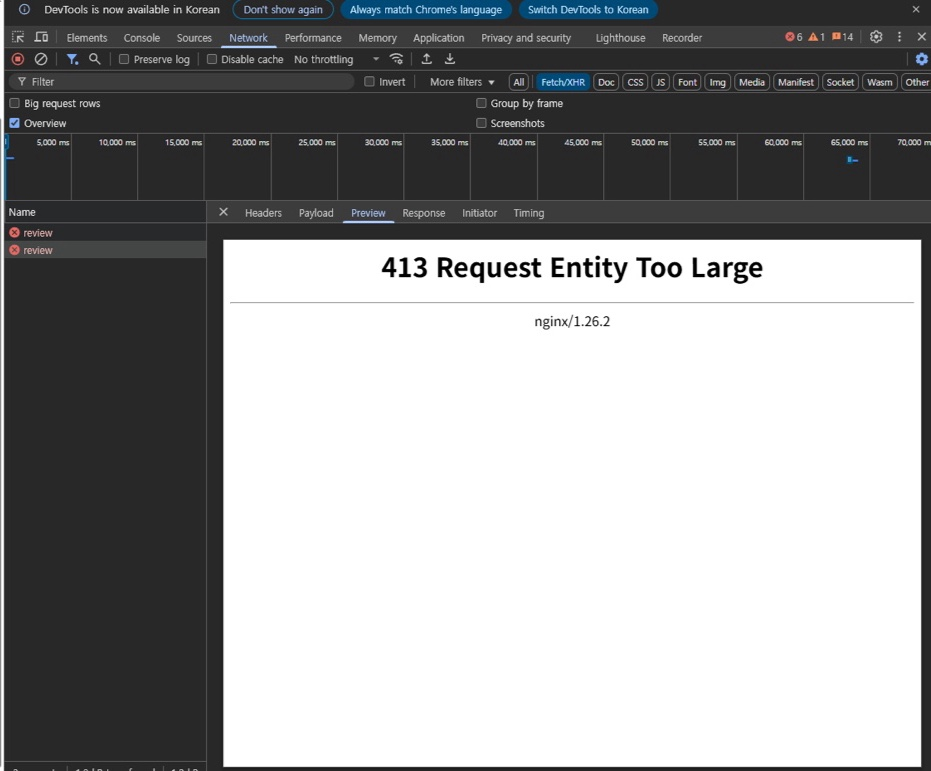 리뷰 작성 페이지에서 이미지 첨부 후 API 를 쐈더니 413 Request Entity Too Large 에러가 발생했다.