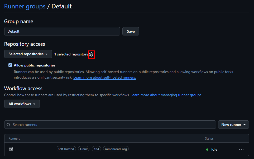 Selected repositories 로 할 경우, 해당 runner group을 사용할 수 있도록 할 repository 를 설정합니다.