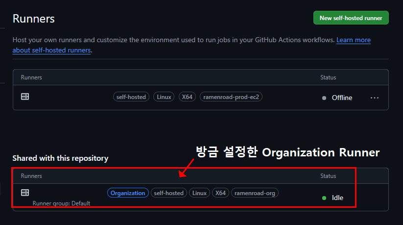 5. Repository 의 Settings > Actions > Runners 에서 Organization runner 가 제대로 할당되었는지 확인합니다.